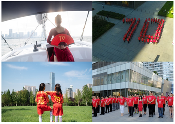 大连时代广场于九月全网呈现《国潮时代》主题视频,将跑酷、舞蹈、足球及纹身女孩,融入到大连的街景、公园、大海及大排档的场景中,以当代青年视角去既有历史感又年轻时尚的老大连,为大连的历史性文化添加新鲜血液,呈现出动态与美感的大连,在地标建筑及人文元素中加入美感的输出。片中交替出现数字70,演员的红色服装道具贯穿全篇,最后场景以时代广场的员工组成的数字70结尾,呼应主题,庆贺祖国成立70周年。