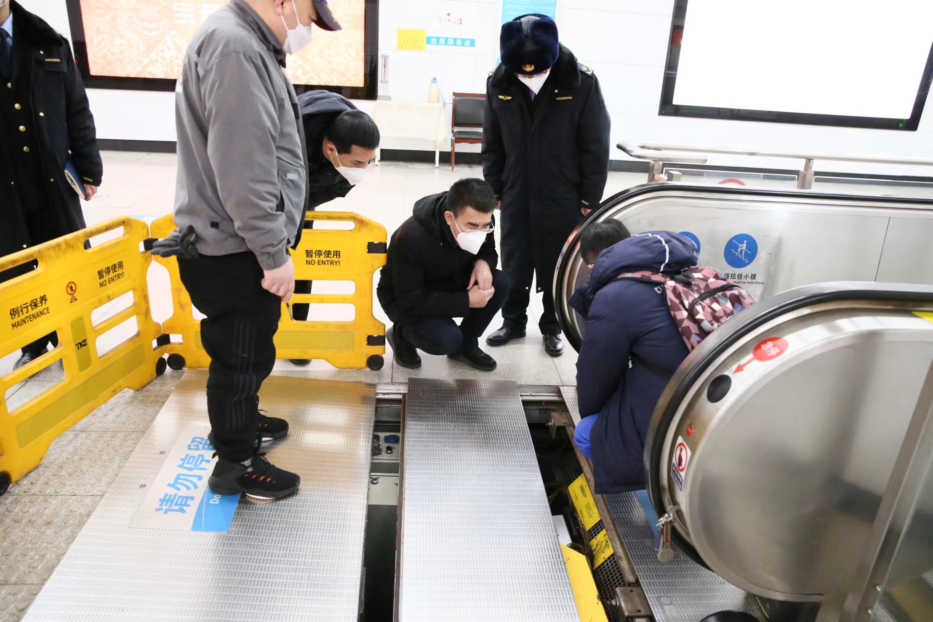 随后,来到地铁2号线人民广场车站,检查了电梯的运行和维护保养情况。现场抽查一台自动扶梯,查验了制动器监控和检修盖板、楼层板电气安全装置的状态,试验了紧急停止开关和梳齿板保护装置的动作情况。