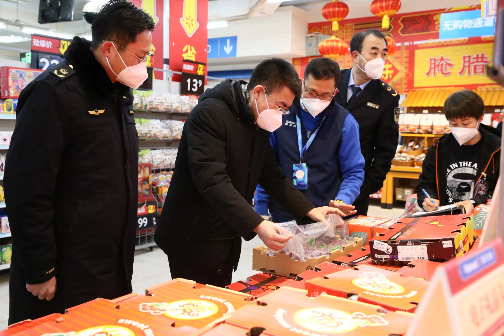检查组一行首先来到大连沃尔玛百货有限公司,现场检查了蔬菜、水果等节日期间热销食品情况,查看了相关食品的供货商资质和进货凭证、散装食品“三防”设施、散装熟食的贮存温度及标签标识、现场制售食品的进货来源、添加剂使用及粮、油、肉、蛋、奶、果蔬等重要民生商品的明码标价、价格公示等情况。