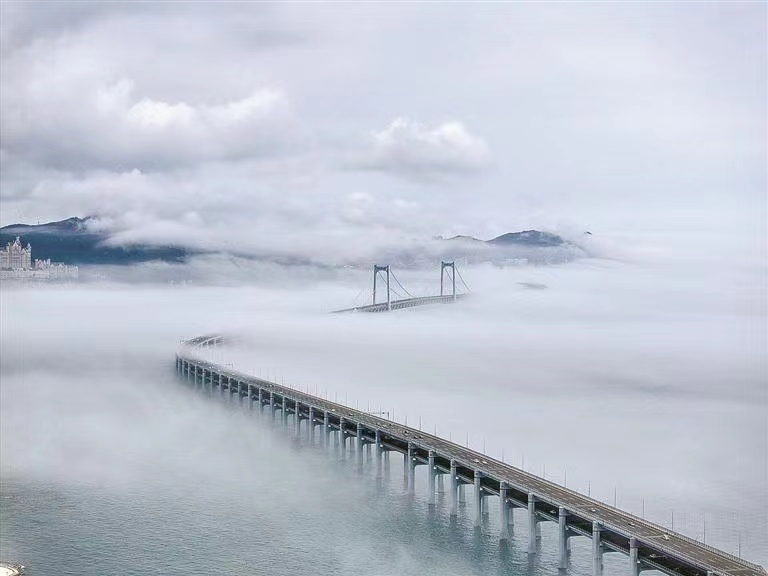 昨日,洁白的平流雾如万马奔腾般源源不断地从海上涌向陆地,滨城海岸线被团团白雾所笼罩,星海湾大桥在白雾中时隐时现,恍若神龙见首不见尾,如梦似幻,充满了神秘感,整个海岸线呈现出流云浮动的壮美画面。