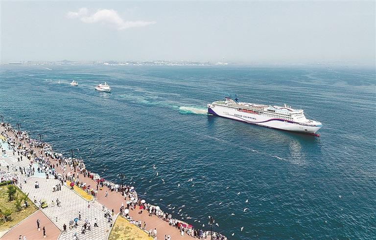 船队经过港东五街爱墙广场,和游客近距离互动。大连新闻传媒集团记者王华 摄