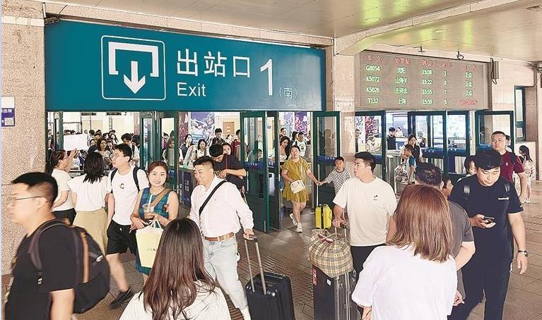 进入8月以来,大连旅游季不断升温,游客数量持续增长。据悉,大连站、大连北站两站暑期预计发送旅客358万人次,日均5.8万人次。图为大连站南出站口人流如织。