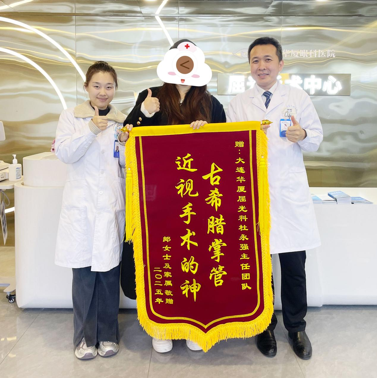 在大连华厦眼科医院杜永强主任的办公室里,挂着一面与众不同的锦旗。上面没有写“妙手回春”或“医术精湛”,而是俏皮地写着 “古希腊掌管近视手术的神”。