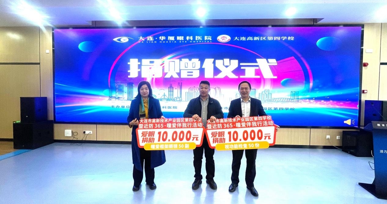在启动仪式现场,大连华厦眼科医院总经理陈红云先生与业务院长、近视防控专家卢燕教授作为院方代表,向高新区四所合作学校进行了公益捐赠。本次捐赠将专门用于为区内斜弱视、低视力学生提供眼健康检查评估及康复训练50人次,并捐赠“瞳爱”框架眼镜50副。这份精准的爱心,不仅为有特殊视觉健康需求的孩子们带来了实实在在的帮助,更传递了社会对他们健康成长的真切关怀。