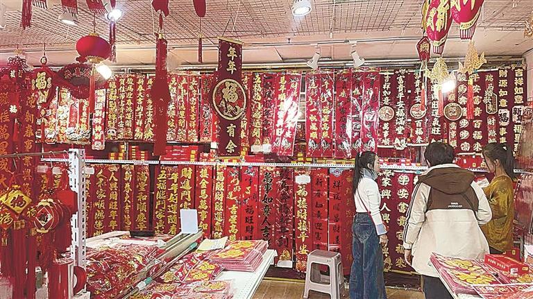 在琳琅满目的春节年俗商品中,色彩鲜艳、寓意吉祥的“年画娃娃”带来的“怀旧风”分外醒目。“我们这些属于‘新年画’系列,是在传统年画基础上添加了创意。”双兴商品城商户车文志介绍,“新年画”产品保留了传统年画的民俗性、观赏性,融合了现代都市人的怀旧情结,并加上多种创意元素呈现全新视觉效果,以浓郁的国潮风受到消费者青睐。不少上了年纪的消费者每年都会来购买,以此追寻儿时记忆中的年味,也有不少年轻人为之心动,“有个小姑娘一下买走了四张,说就喜欢这种传统韵味。”